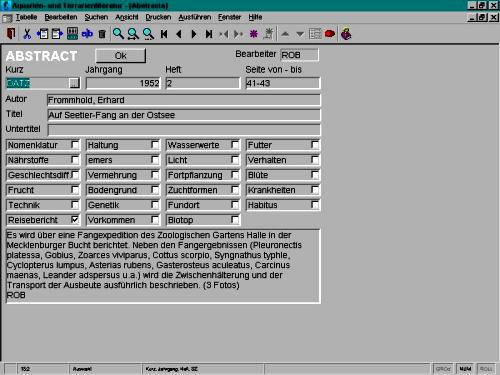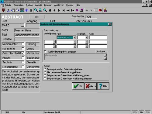Die Handhabung der Datenbank ist weitgehend selbsterklärend, trotzdem gibt es noch eine umfangreiche Hilfe. Exemplarisch soll deshalb an dieser Stelle nur die Suchfunktion mit Hilfe der „Lupe" erläutert werden.