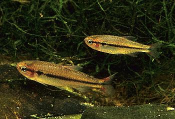 Der erste Salmler, den ich ihnen hier vorstellen möchte, wurde erst im Jahre 2001 wissenschaftlich beschrieben und stammt aus Rio Grande do Sul, dem südöstlichsten Bundesstaat Brasiliens, der direkt an die südlichen Nachbarländer Argentinien und Uruguay grenzt. Dort hat Astyanax cremnobates ein relativ begrenztes Verbreitungsgebiet nördlich der Hauptstadt dieses Bundesstaates, Porto Alegre. Sie lebt in den Oberläufen einiger Flüsse die zum System des Rio Taquari zählen, der in die Lagoa dos Patos bei Porto Alegre mündet. Diese Flüsse, der Rio Caí, Rio Tainhas und Rio das Antas sowie der Oberlauf des direkt in den Atlantik entwässernden Rio Maquiné bilden den Lebensraum dieses dort endemischen Salmlers. Die Art wird zum, im Südosten Brasiliens dominierenden Artenkomplex um Astyanax scabripinnis (Jenyns, 1848) gezählt. Bei all diesen Fischen handelt es sich um relativ gedrungene Astyanax mit kurzem, stumpfem Kopf. Sie entsprechen eigentlich gar nicht so sehr dem Bild dieser Sammelgattung, unter der man sich sonst eher silbrige, seitlich mehr oder weniger stark zusammengedrückte Salmler mittlerer Größe vorzustellen hat. Im Gegensatz zu vielen Astyanax ist A. cremnobates auch kein Fisch, der im Aquarium quirlig umherschwimmt. Die Art verhält sich eher bedächtig und steht oft ruhig im Freiwasser oder zwischen Wasserpflanzen. Ausgewachsen scheint der Taquarisalmler, wie wir die Art nach ihrer Herkunft benennen sollten, mit etwa 6 cm Länge zu sein. Dabei werden die Männchen offenbar etwas größer als ihre rundlicher wirkenden weiblichen Artgenossen und sind robuster gebaut. Sie besitzen auf ihrer großflächigeren Afterflosse kleine Häkchen, mit denen gern im Kescher hängen bleiben. A. cremnobates zeigt über einer beige-braunen Körpergrundfarbe einen breiten dunklen Längsstreifen, der sich vom Auge bis zur Schwanzwurzel und in die mittleren Strahlen der Schwanzflosse hineinzieht. Er wird oberseits von einem schmalen messingfarben reflektierenden Streifen begrenzt. Hinter dem Kiemendeckel befindet sich ein dreieckiger Schulterfleck, der in das Längsband integriert ist. Die unpaaren Flossen, besonders die Schwanzflosse können bei eingewöhnten Tieren herrlich rot leuchten. Die ist besonders bei dominanten Männchen der Fall, die kleine Territorien um Pflanzenbüschel herum besetzen und von dort aus vorbeischwimmende Weibchen anbalzen. Im Aquarium stellten sich die Taquarisalmler als relatuv empfindlich gegenüber hohen Temperaturen heraus. Ideale Haltungstemperturen sollten deshalb für diese Art nicht über 24°C liegen und können durchaus zeitweise bis auf 18°C absinken. Da A. cremnobates in ihrer Heimat die Oberläufe von Flüssen bewohnt, lieben die Fische recht starke Strömung auch im Aquarium. Taquarisalmler verhalten sich sowohl gegenüber Artgenossen als auch anderen Arten relativ friedlich. Nur dominierende Männchen können zeitweise etwas ruppig werden.