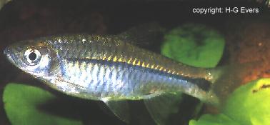 Unsere Tiere gehören ganz eindeutig zu den großen Rasbora-Arten. Der auffällige blauschwarze Längsstreifen mit einer silbernen Begleitbinde, die gelben Flossen und der attraktive Blauspiegel erfüllen neben den Schuppen- und Flossenstrahlenwerten die Merkmale, die nach SMITH für Rasbora lateristriata (BLEEKER, 1854) zutreffen. Der optische Eindruck allerdings entspricht absolut dem von LÜBECK fotografierten und in STERBAs „Süßwasserfische der Welt" (S. 170) abgebildeten Rasbora sumatrana, und der Bearbeiter des Kapitels, A. ZARSKE, bezeichnet die Angaben von SMITH als falsch.