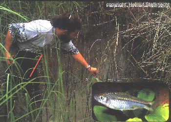 Vertrauenerweckend oder gar „fischhöffig" sah das kleine Gewässer am Straßenrand wirklich nicht aus: Trübes, flaches Wasser, von dem fauliger Geruch aufstieg, schwarze Röhrichtstengel, schlammiges Ufer. Aber mein Freund Jan hatte etwas huschen sehen und blieb dort, während ich abwinkte und auf Dermogenys-Suche weiterging. So blieb es Jan vorbehalten, unsere Fischsammlung um einige kaum 2 cm messende Bärblinge zu erweitern. Außer einem schwarzen Längsstrich waren in dieser Größe keine nennenswerten Merkmale zu erkennen.