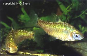 Die bräunlichen Eier sind recht klein, erstaunlicherweise schlüpfen aber Jungfische, die so groß sind wie junge Titteya-Barben. Auch während der Aufzucht der Jungen wurde ich an diese ebenfalls von Sri Lanka stammenden Kleinbarben erinnert. In den ersten zwei Wochen sieht man die Jungfische nur, wenn man das Aquarium leicht bewegt. Dann erst l"sen sie sich vom Boden, wo sie im sich ansammelnden Mulm nach Futter suchen. Erst mit der dritten Woche „klettern" sie an den Scheiben hoch oder schwimmen zwischen den mittlerweile eingebrachten Töpfen mit Jungpflanzen herum.
