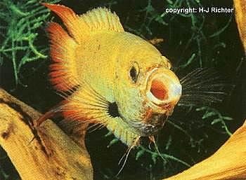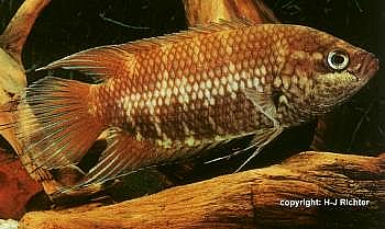 Die Eier sind relativ groß und von auffallend goldgelber Farbe. Einige Schaumblasen, keinesfalls ein Nest, wie es andere Arten zu bauen vermögen, lagen seitlich neben dem zum Klumpen gesammelten Laich, der vor allem vom Weibchen bewacht und gepflegt wurde. Das Männchen umstrich das Revier, in dessen Mitte das Weibchen unter dem Nest stand. In unregelmäßigen Abständen kam das Weibchen auf das Männchen zugeschwommen, forderte es zur Imponierhaltung auf und schwamm zum Nest zurück. Dort betupfte es den Laich mit dem Maul, schöpfte Luft und spie einige Schaumblasen aus, die jedoch stets neben dem Laichklumpen aufstiegen und nicht eingebaut wurden.