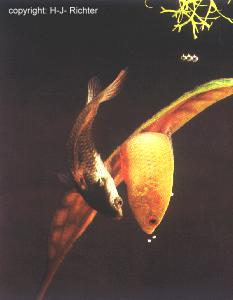 So machte es auch das Paar, das ich aus den Jungfischen von Padukka herangezogen hatte. Es dauerte recht lange, bis ich die Geschlechter unterscheiden konnte, da die Wildfänge „ewig" graubraun blieben. Erst die grünen Spiegel auf dem Vorderkörper der Weibchen und das Auswachsen der mittleren Schwanzflossenstrahlen der Männchen sowie die beginnenden Revierkämpfe nach zehn Monaten (!) machten mich sicher. Offenbar sind die Bedingungen bei der Nachzucht im Aquarium besser, denn den von mir aufgezogenen Jungfischen kann ich spätestens nach vier Monaten ansehen, wer Männchen und wer Weibchen wird.